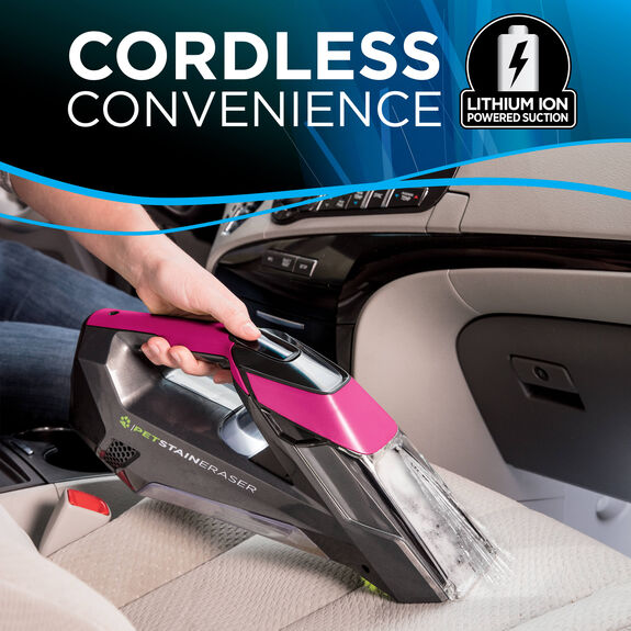 Bissell pet stain eraser deluxe cordless portable carpet cleaner reviews. For added convenience the cordless Bissell carpet and upholstery cleaner features a lithium ion battery with indicator lights. I have two rugrats that seem to believe my wifes car is their personal garbage bin. Tackle all the toughest pet stains with the Bissell pet stain eraser cordless portable carpet cleaner.